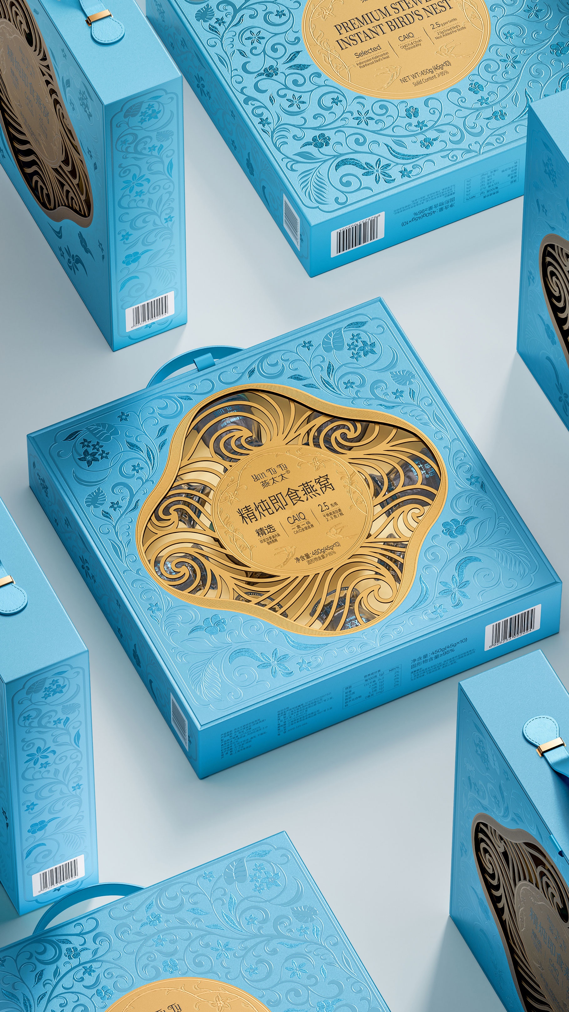 整體包裝創意以獨創三層視覺敘事:中部采用東方園林“框景”手法打造鏤空視窗,湖藍色藤蔓紋樣層疊延展,再現雨林生態的呼吸韻律,虛實交錯間透現燕窩瑩潤質感。